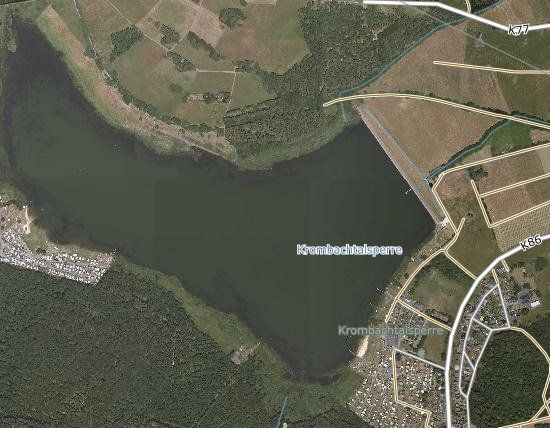 Die Krombachtalsperre ist ein Segler- und Surferparadies. Das tiefe und in der Regel unverkrautete Gewässer ist hoch gelegen. Da geht immer ein guter Wind. Vom Campingplatz aus (Weststrand im Bild links/ Ankunft Radweg vom Eichenpark) beobachtet man vom "Cafe-Bistro-Ponderosa" die Segel-Tonnenmanöver bei einem Cafe und gutem Stück Kuchen.